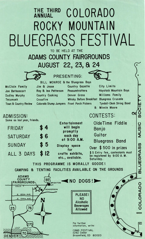 With less than six months to prepare, CBMS made arrangements to rent the Adams County Fairgrounds in Henderson. Music would be presented in the rodeo arena (with Charles Sawtelle running sound), and camping was available nearby. As plans progressed, Monroe made a special trip to Colorado to coach CBMS members on marketing and publicity. "He taught us what to do. And it worked. We had a big crowd," remembers Little. An estimated 6,500 people attended the 1st Annual Rocky Mountain Bluegrass Festival. The first four years of the festival earned a total profit of more than $20,000.The early lineups boasted major national talent including Lester Flatt, Ralph Stanley, and Jim & Jesse. But the highlight was Big Mon himself. “He'd park the Bluegrass Express someplace where people knew where he was,” recalls Little. “He liked to be seen and to talk to people. And he'd play a lot with people.“ Also, we were reminded that you don‘t dance during the gospel numbers,” remembers CBMS board member George Watson.
