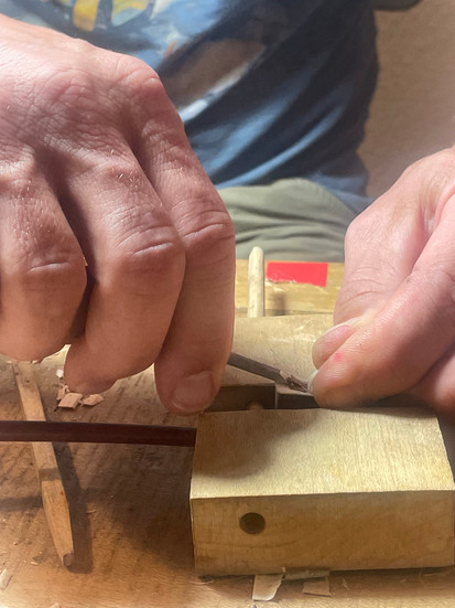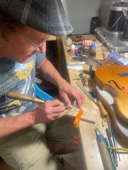 As Will talked to me, he worked on a bow. He asked me, “Do you know what a wedge is?” Well, I know what a wedge is in the general sense, but related to the bow? Even though I just had a bow rehaired by Will, I did not really know the anatomy. In front of my eyes, Will whittled away at a tiny piece of Willow to make an exactly sized and shaped tiny wedge to insert into a socket in the frog. He explained that it keeps the ribbon of horse hair spread out like it needs to be. While the bow hairs were waiting for the wedge to be inserted to keep them in place, Will used a dog comb that he had crafted to spread the hairs out to ready them for the wedge. It was quite satisfying when he was able to perfectly insert that wedge into the socket. After that, I was curious how the horse hair is attached to the bow tip. He extracts a plug from the tip mortise that holds the hairs in place. I told him it reminded me of tooth extraction. He laughed and it said it kind of does. Then we talked about dental work for a bit. Ha!